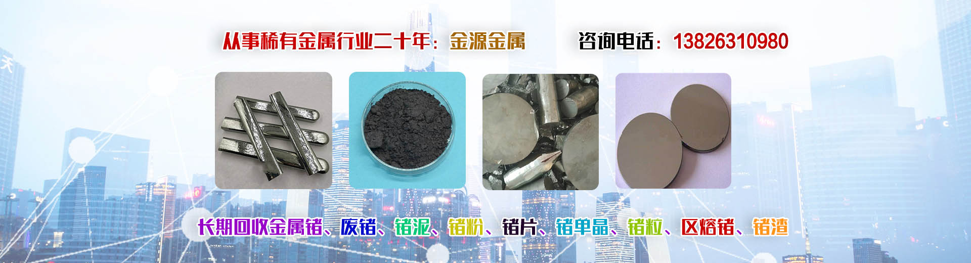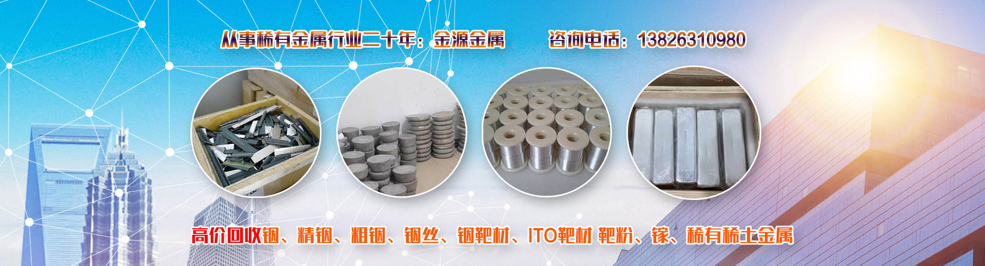 韶關(guān)市金源金屬材料有限公司坐落于中國廣東省韶關(guān)市,長期收購回收銦、精銦、粗銦、銦絲、銦靶材、ITO靶材靶粉、回收金屬鍺、鍺錠、鍺粉、鍺片、回收鍺單晶、單晶鍺、鍺粒、區(qū)熔鍺、工業(yè)鍺、廢鍺、鍺泥、鍺渣、二氧化鍺回收、四氯化鍺、有機(jī)鍺、銀、純銀、銀靶材、高價(jià)收購回收ITO廢靶、回收廢銦、廢銦沙、廢銦渣、回收粗銦、廢銦絲、廢銦珠、廢銦箔、廢銦棒、收購銀焊條、銀焊絲、導(dǎo)電銀膠、金屬鎵、硝酸鎵、氧化鎵、三氯化鎵、氯化鎵,供應(yīng)及回收氧化鎵、氫氧化鎵、碲化鎵,硒化鎵,銦粉,氧化銦、氯化銦、硫酸銦、硫化銦、醋酸銦、氫氧化銦、硒化銦,碘化銦,銅銦鎵硒,含金、銀、銦、銠、鈀、鎵、鍺等稀有貴金屬材料,稀土金屬材料、氧化鏑、氧化镥、氧化鋱、氧化鐠釹等回收。
